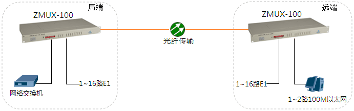 局端站與遠(yuǎn)端站間通過(guò)光纖點(diǎn)對(duì)點(diǎn)通訊。局端站1~16路E1接口(2M接口)及1~2路共享速率100M以太網(wǎng)接入到ZMUX-100后轉(zhuǎn)換成光信號(hào),再連接上光纖傳輸?shù)綄?duì)端站還原出來(lái)。